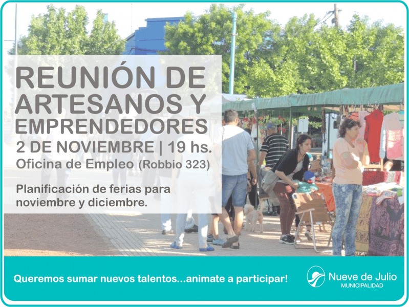 La Oficina de Empleo de la Municipalidad de Nueve de Julio, informa que el próximo miércoles 2 de noviembre, a las 19 hs., en sus oficinas de Robbio 323, se desarrollará una nueva reunión de artesanos y emprendedores, donde se realizará la planificación de ferias para noviembre y diciembre, bajo el lema “Queremos sumar nuevos talentos…, animate a participar!”.