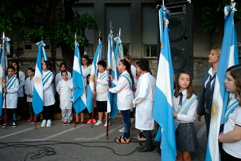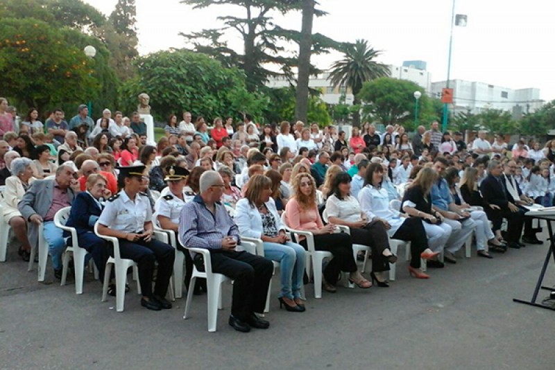 El acto protocolar comenzó siendo aproximadamente las 19:30 hs., frente al establecimiento de calle H. Yrigoyen, con las palabras de apertura al acto, presentación de autoridades y lectura de salutaciones.