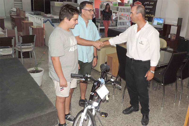 Los convecinos Alejandro Bellante, quien participó a través de su compra en “La Fama Hogar” y Guillermo Merlino, quien se hizo acreedor de la bicicleta, retiraron sus premios, entregados por el gerente de la firma, Marcelo Suanno.