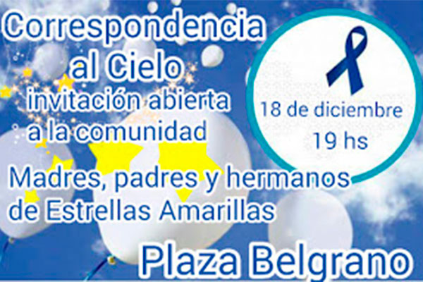 La ONG “Estrellas Amarillas 9 de Julio” se encuentra preparando una original suelta de globos de cierre de año, evento que se ha denominado “Correspondencia al cielo”, y se traduce como un saludo simbólico a los seres queridos que han fallecido como consecuencia de accidentes de tránsito, aunque el mismo no se limita solamente a familias de víctimas viales, sino que es abierto a toda persona la comunidad que desee participar.