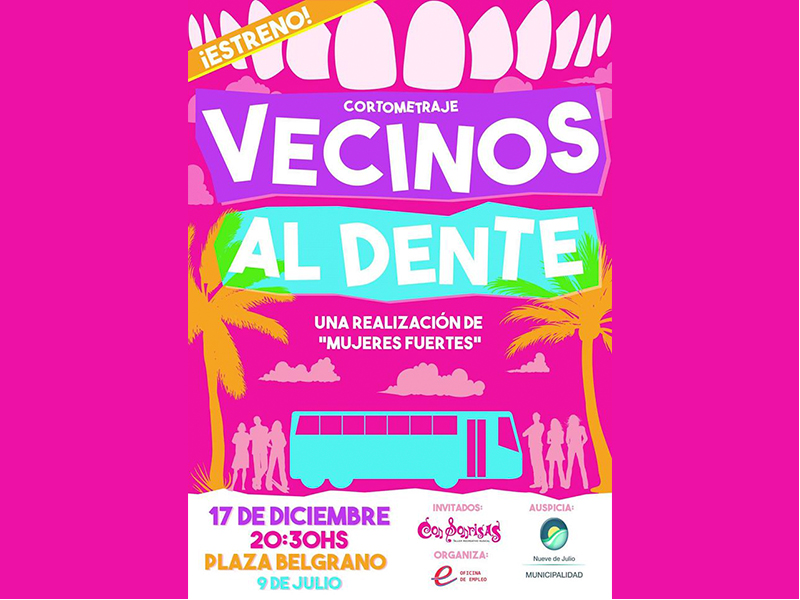 Hoy sábado 17 de diciembre se estrenará el cortometraje “Vecinos al dente”, organizado por la Oficina de Empleo de la Municipalidad de Nueve de Julio. El mismo fue realizado por un grupo de mujeres que se capacitó durante todo el año en el Taller “Trabajo en Equipo y Motivación”, con el objetivo de descubrir habilidades e intereses, fortalecer la autoestima, potenciar la capacidad para tomar decisiones y la creación de nuevos vínculos, mejorando así su empleabilidad y formación laboral. Esta producción audiovisual surge como proyecto final de los encuentros, con ideas aportadas por el grupo, relatando situaciones de la vida cotidiana a través de una comedia de enredos.
