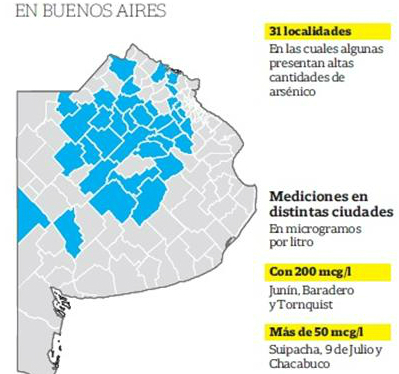 Agustín Ciapponi, coordinador del Centro Cochrane Argentina-IECS, indica a través de un comunicado que en Bolívar se detectaron niveles de hasta 100 mcg/l, mientras que en Suipacha, Lobos y Chivilcoy los valores superan los 100 mcg/l. "Hay regiones de Santiago del Estero donde se superan los 1000 mcg/l" dice Ciapponi.