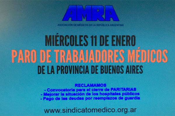 Médicos y profesionales de la salud pública bonaerense del gremio CICOP realizarán hoy miércoles 11 de enero, el primer paro de 2017 a la gobernadora de Cambiemos María Eugenia Vidal en los 80 hospitales que de ella dependen –incluido el de nuestra ciudad-, en una medida de fuerza que tiene como objetivo “ratificar el pliego de reclamos en curso, con centro en salarios, precarización laboral, desgaste y residentes, e incorporando con la misma importancia la prevención de violencia en hospitales y centros de salud”.