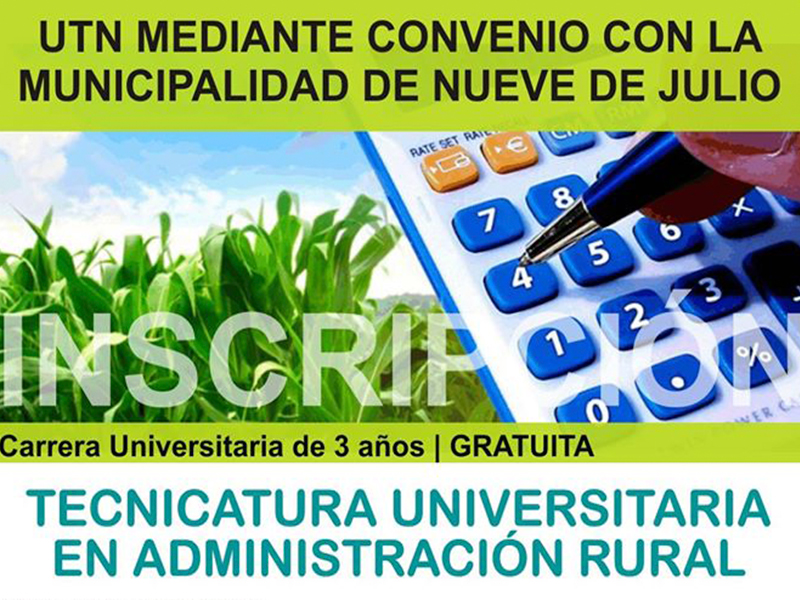 La Dirección de Educación, y en convenio con la Universidad Tecnológica Nacional de San Nicolás, recuerda que se encuentra abierta la inscripción para la Tecnicatura en Administración Rural; hasta el 31/1/2017 en la oficina de la Dirección General de Educación, Robbio 322, teléfono 422227.