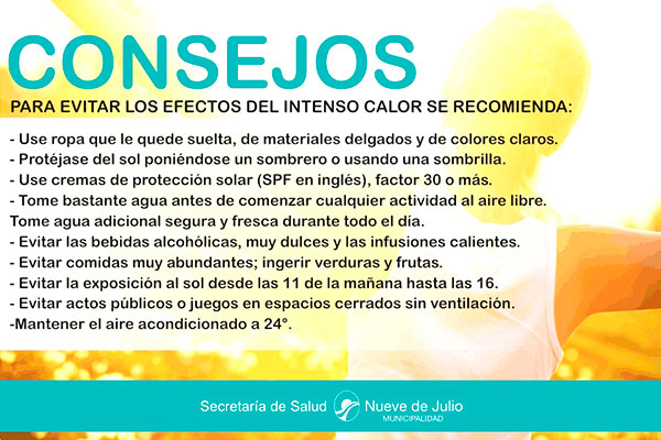 – Evitar la exposición al sol desde las 11 de la mañana hasta las 16. Programe las actividades vigorosas al aire libre para horas no tan calurosas; como antes de las 10 hs o después de las 18 hs.
