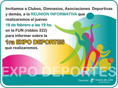 La Municipalidad de Nueve de Julio, a través de la Di- rección de Deportes, invita a clubes, gimnasios, asociaciones deportivas y demás instituciones a la reunión informativa que se realizará el jueves 16 de febrero a las 19 hs., en la Fundación Universitaria (Robbio 322), a fin de comunicar detalles sobre la realización de la 1ra. Expo Deportes que se realizará próximamente.