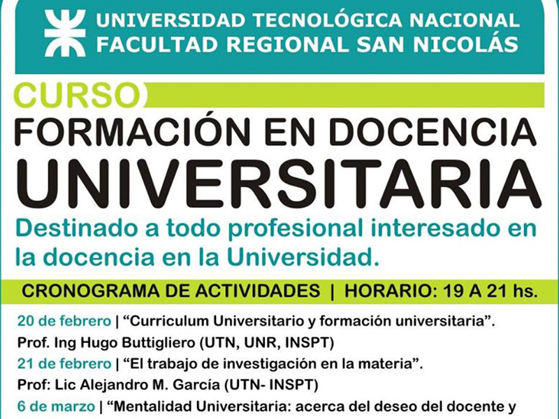 Con la organización de la Municipalidad de Nueve de Julio, a través de la Dirección General de Educación y la Universidad Tecnológica Nacional (UTN), a través de su Facultad Regional de San Nicolás, esta casa de altos estudios dictará en la Cámara de Comercio e Industria de nuestra ciudad un interesante curso sobre “Formación en docencia universitaria”, destinado a todo profesional interesado en la docencia en el nivel superior.