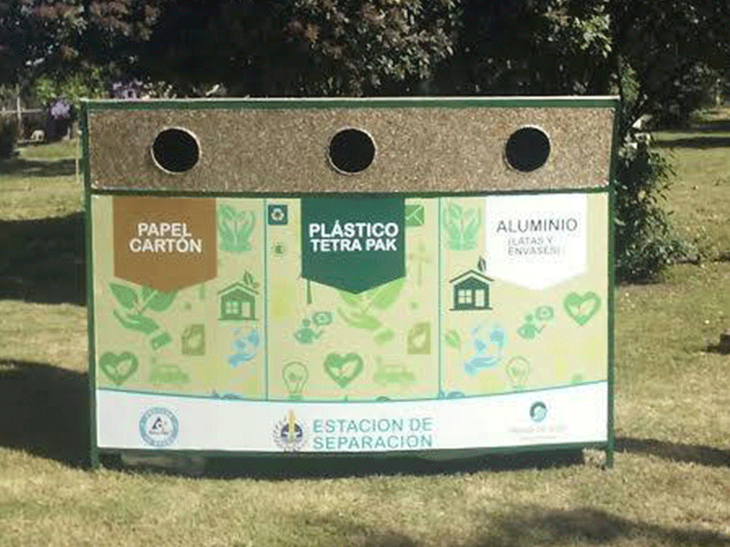 Se trata de contenedores para el depósito de papel y cartón, plásticos y envases tetra, y aluminio, realizados en planchas de tetra pack, conformadas con material reciclado y prensado, que ofrece gran resistencia a la temperatura y las lluvias.