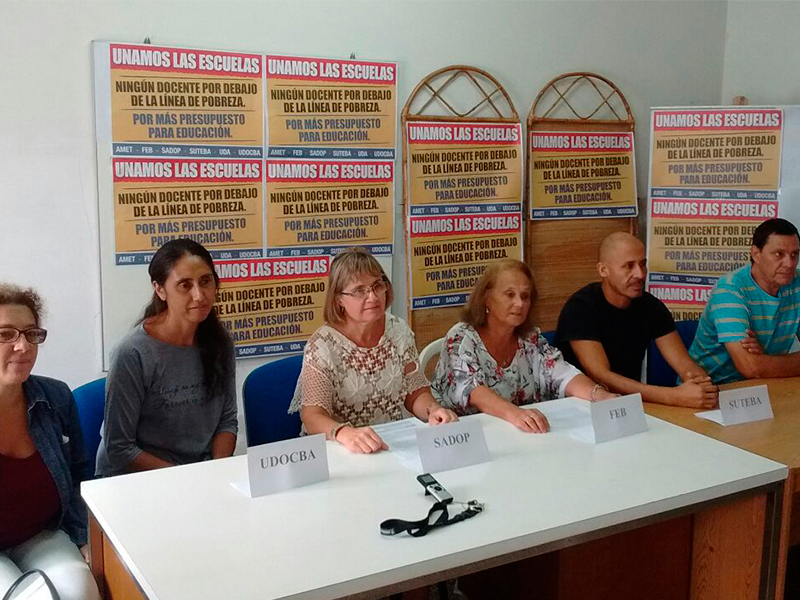 Dirigentes gremiales docentes Udocba , Feb , SUTEBA ,Sadop  y Amet de nuestro medio brindaron una conferencia de prensa ayer sábado en la sede de la Feb para reafirmar la convocatoria al paro docente por 48 horas (lunes y martes) y la adhesión a la jornada de reclamo por el Día de la Mujer del miércoles.