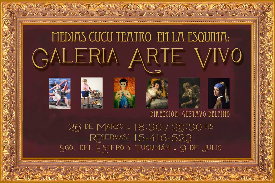 Este domingo 26 de marzo, Medias Cucú teatro presentará en La Esquina Arte y Cultura, "Galería, arte vivo" cuadros que hicieron historia, historias que se hicieron cuadros. Las funciones serán en doble franja horaria, a las 18.30hs y a las 20.30hs y el espectador vivencia una experiencia que combina las artes plásticas y el teatro.