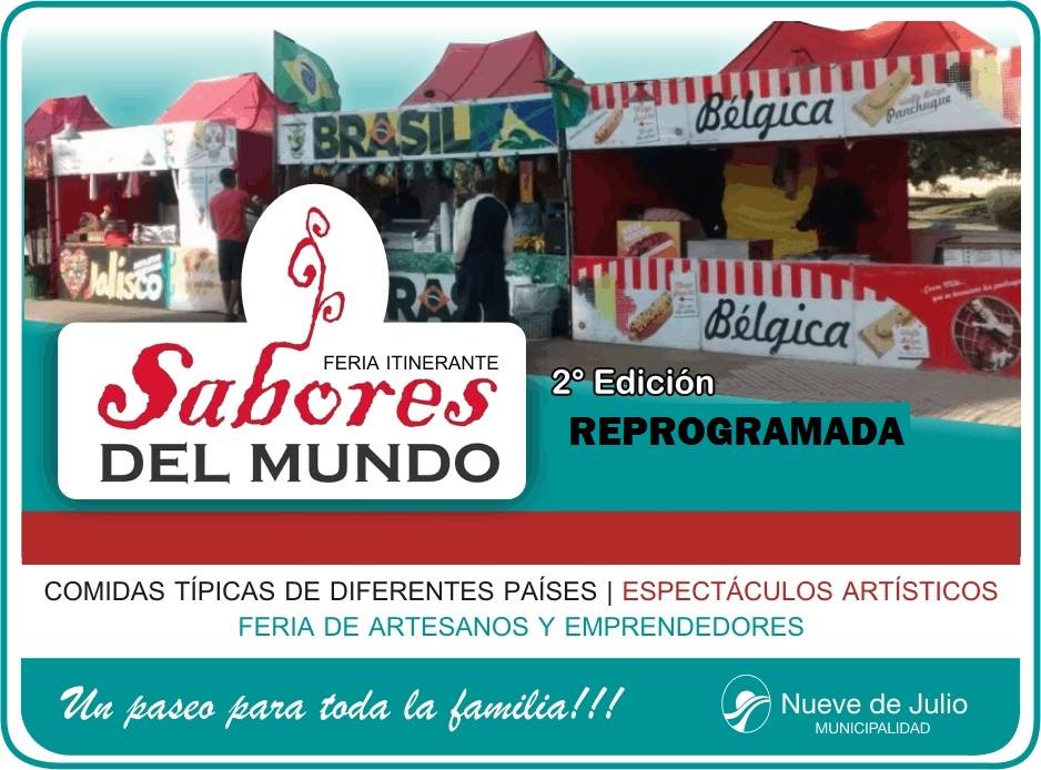 La Secretaria de Cultura, Educación y Deportes informa que debido a la amenaza de lluvias pronosticada, la segunda edición de la feria “Sabores del Mundo” que estaba originalmente programada para este fin de semana, ha quedado reprogramada para entre el 28 de abril y 1º de mayo próximo.