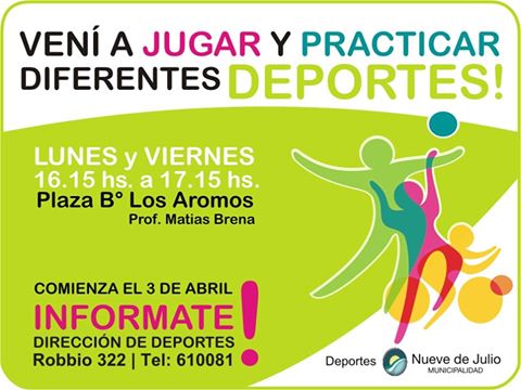 Desde el  próximo lunes 3 de abril, en la Plaza de Barrio los Aromos, la Municipalidad de Nueve de Julio, a través de la Dirección de Deportes, pondrá en marcha un interesante programa deportivo en barrio Los Aromos, invitando a los chicos y chicas a jugar y practicar diferentes deportes.