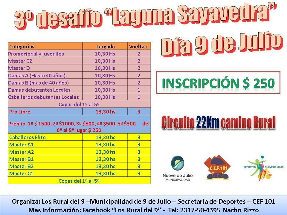 A través de la Dirección de Deportes, el grupo “Los Rural del 9” y el Centro de Educación Física (CEF) Nro. 101, se ha comenzado a preparar el 3er. Desafío “laguna Sayavedra”, tradicional prueba de rural bike que se habrá de desarrollar el día 9 de Julio, con un circuito de 22 km. para las distintas categorías.
