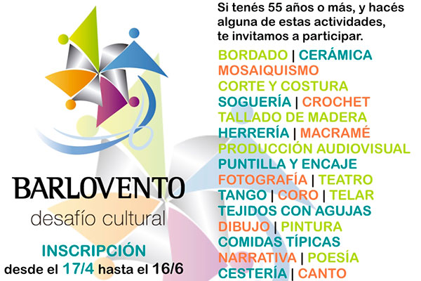 La Secretaría de Cultura, Educación y Deportes de la Municipalidad de Nueve de Julio, informa que ya está abierta la inscripción del programa “Barlovento, Desafío Cultural”, para las personas que tengan 55 años o más y quieran participar en alguna de las actividades propuestas por las direcciones de cultura de la Región de los Vientos.