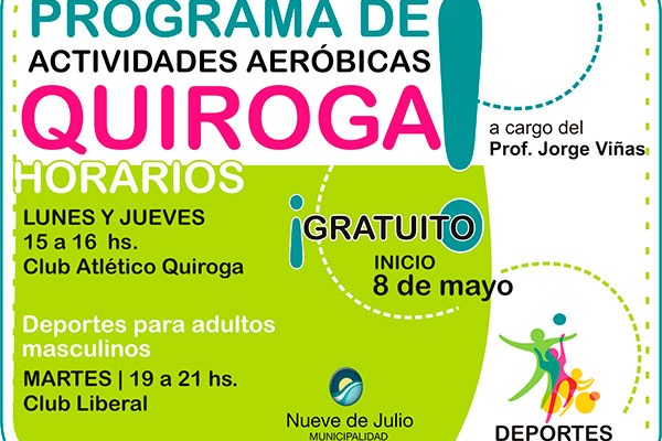 Con la coordinación del Prof. Jorge Viñas, y desde la fecha indicada y en forma totalmente gratuita, los día lunes y jueves, de 15 a 16 hs., se dictarán en el Club Atlético Quiroga actividades aeróbicas; mientras que los días martes, de 19 a 21 hs., se brindarán deportes para adultos masculinos, en  el Club Liberal.