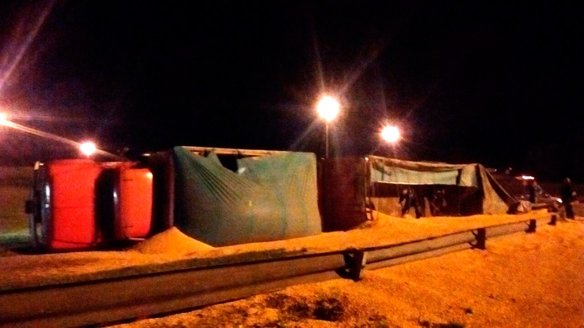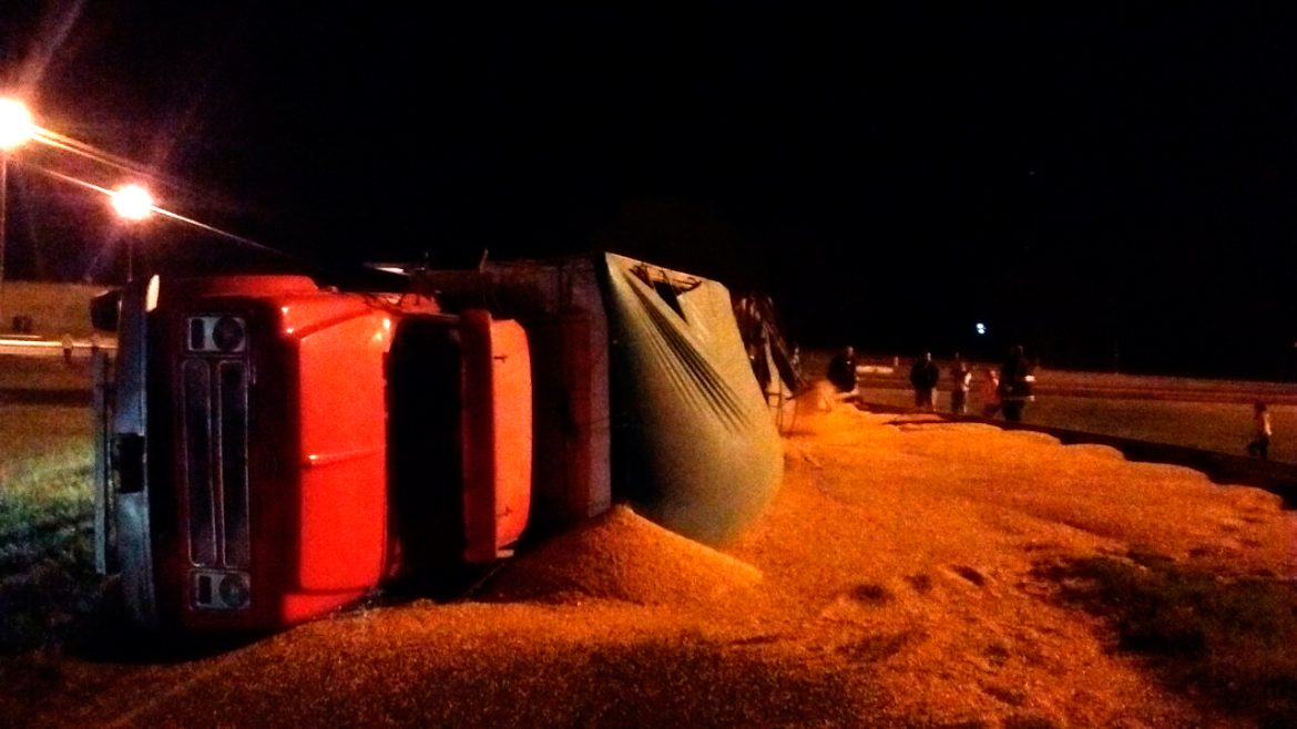 Bomberos Voluntarios de 9 de Julio fueron convocados desde las inmediaciones del puente de Rutas 5 y 65, donde por causas que se tratan de establecer, un camión de gran porte (Chevrolet con acoplado) volcó y perdió toda su carga maíz en la subida para retomar ruta 65 hacia Los Toldos.