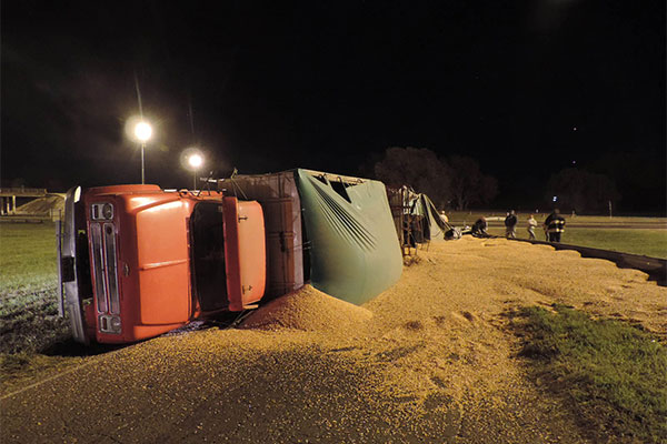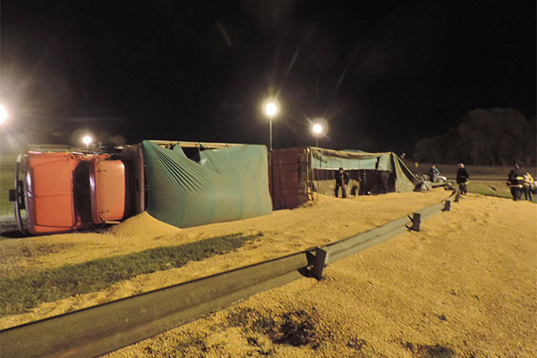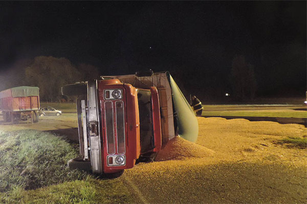 Anoche aproximadamente a las 20.30hs. un camión marca Chevrolet, volcó en la subida del puente de ruta provincial 65 que cruza Ruta 5, quedando de costado sobre la banquina y parte de la cinta asfáltica, y su carga de maíz desparramada en la ruta, por lo que la misma quedó cerrada al tránsito hasta que los Bomberos finalizaron el trabajo de limpieza. El camión, tras aproximadamente una hora, fue puesto sobre sus cuatro ruedas tirado por otro camión y cadenas; la carga restante en el camión fue trasladada a otro vehículo de carga por personal de la cerealera trabajó en el camión para recoger el cereal derramado con un elevador de cereal (chimango) y palas.