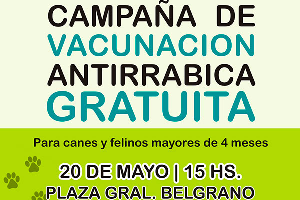 Desde la Dirección General de Albergue Canino de la Municipalidad de Nueve de Julio, se llevará adelante el sábado 20 del corriente, desde las 15 hs., en Plaza General Belgrano, una nueva campaña de vacunación antirrábica gratuita para caninos y felinos mayores de 4 meses.