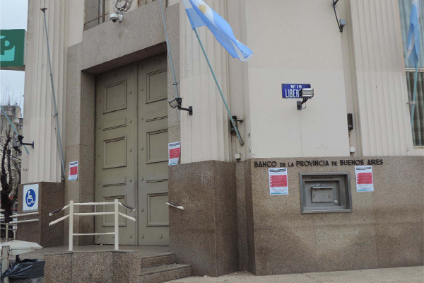 El Banco Provincia puede verse totalmente empapelado con volantes de la protesta laboral.