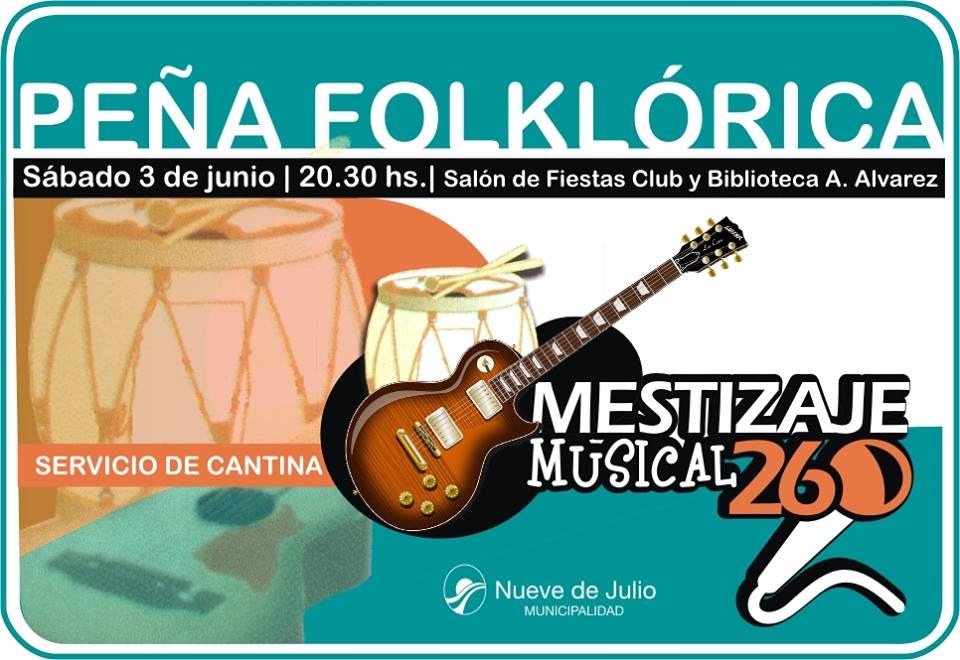 La Secretaría de Cultura, Educación y Deportes de la Municipalidad de Nueve de Julio, a través de la Dirección de Cultura, informa que el próximo sábado 3 de junio a partir de las 20,30 hs. se llevará adelante una Peña Folklórica en el Salón de Fiestas del Club Agustín Alvarez, que dará comienzo al ciclo musical que tiene como protagonista al colectivo cultural denominado “Mestizaje Musical 260”.