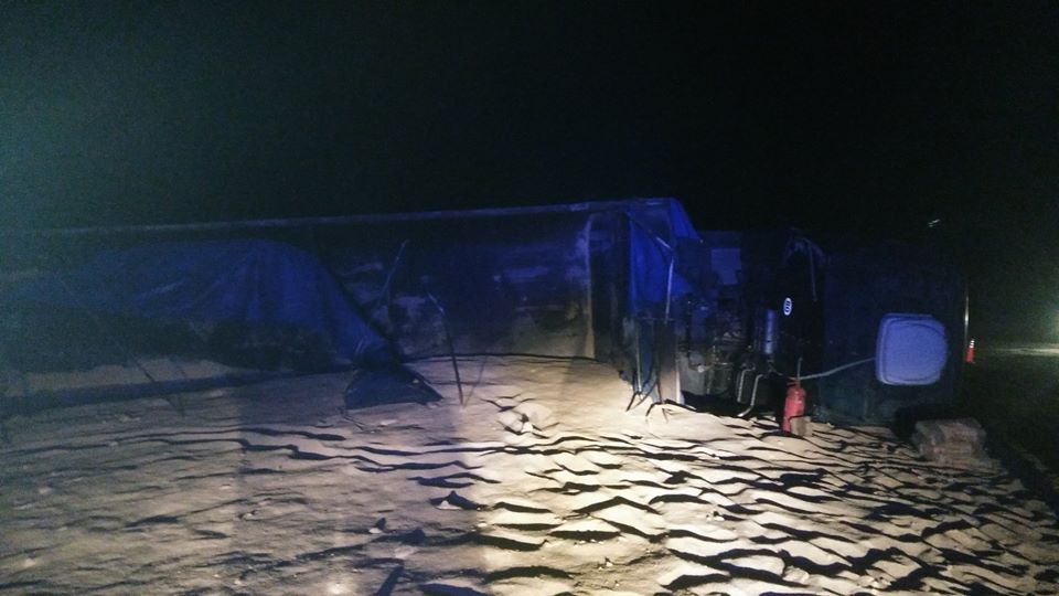Al lugar acudió el cuerpo de Bomberos Voluntarios de Dudignac, que al llegar al lugar observa un camión con semi batea volcado cortando ambas manos de la cinta asfáltica. Por lo que se decide cortar las circulación en forma total sobre dicha ruta, tarea que se realiza en el puente de ruta 5 y 65 por parte de Personal de Policía Comunal.