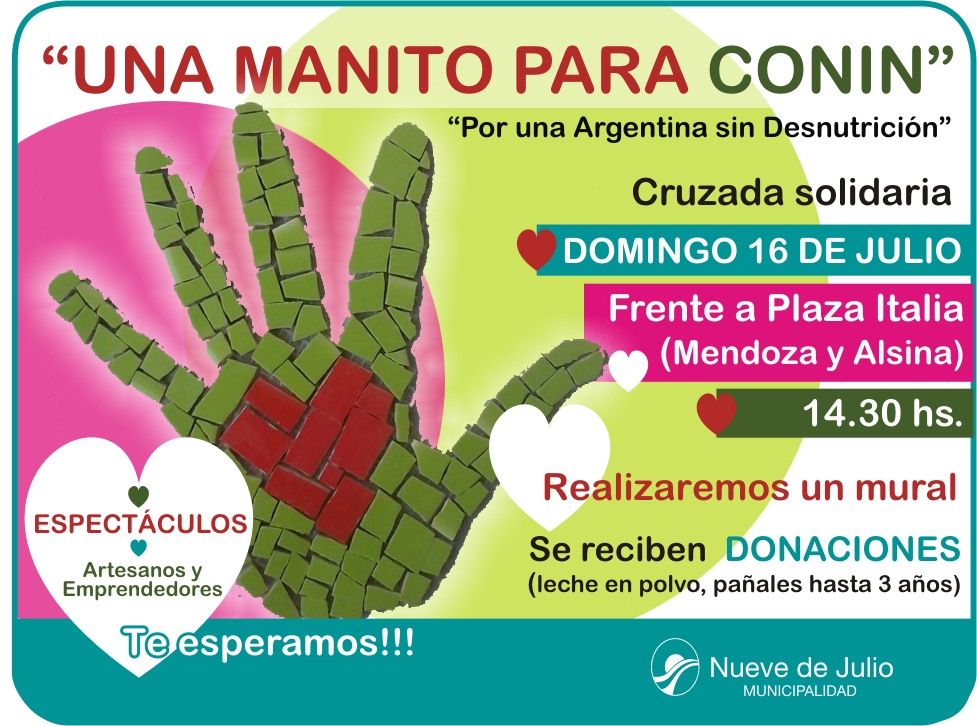 Con el auspicio de la Municipalidad de Nueve de Julio, el domingo 16 de julio, desde las 14,30 hs. y frente a Plaza Italia (Mendoza y Alsina) se realizará una cruzada solidaria en beneficio de la Fundación CONIN, cuya misión es erradicar la desnutrición infantil en la Argentina, denominada “Una manito para CONIN”.