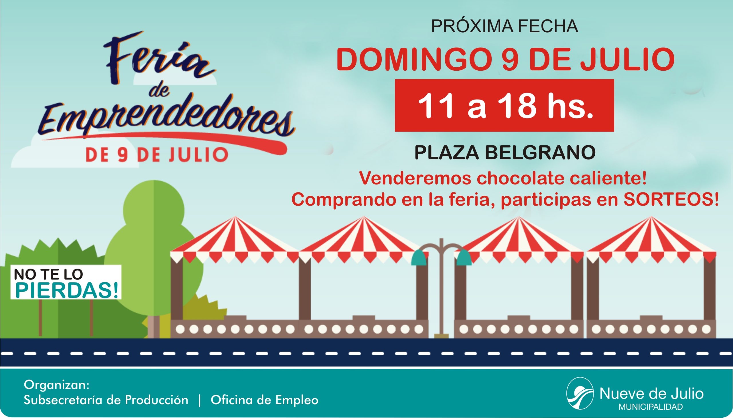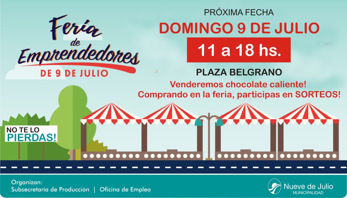 Con la organización de la Subsecretaría de Producción y la Oficina de Empleo de la Municipalidad de Nueve de Julio, este domingo 9, de las 11:00 a 18:00 hs. en Plaza Gral. Belgrano, se llevará adelante la Feria de Emprendedores, en la que se presentarán expositores de nuestra ciudad y el distrito.