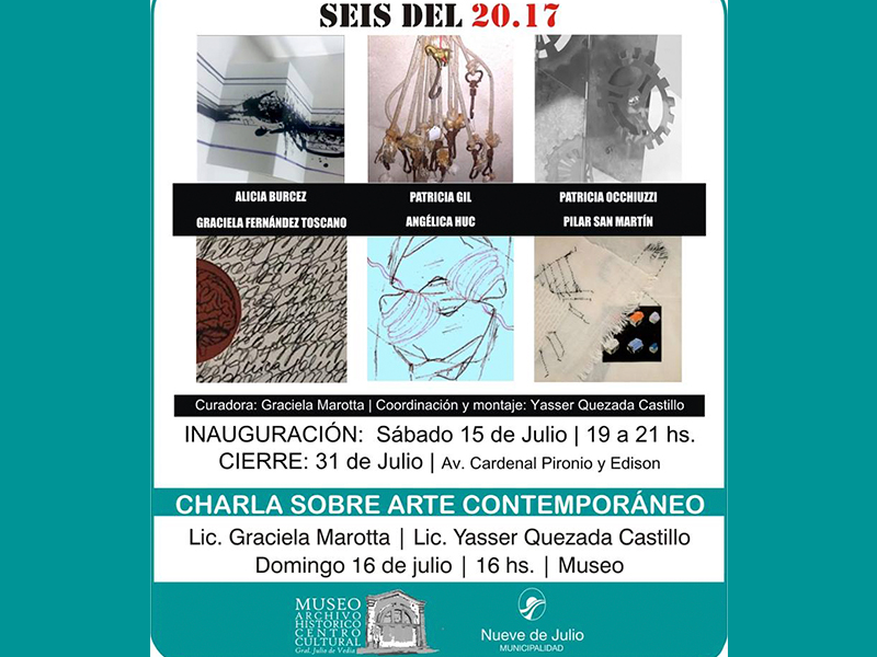 Bajo la organización del Museo, Archivo Histórico y Centro Cultural “Julio de Vedia”, se desarrollará en la sede del mismo, entre el sábado 15 y el lunes 31 del corriente mes de julio la muestra de arte denominada “Seis del 20.17”, en el que expondrán sus obras Alicia Burcez, Graciela Fernández Toscano, Patricia Gil, Angélica Huc, Patricia Occhiuzzu y Pilar San Martín; siendo curadora de la misma Graciela Moratta y Yasser Quezada Castillo la encargada de coordinación y montaje.
