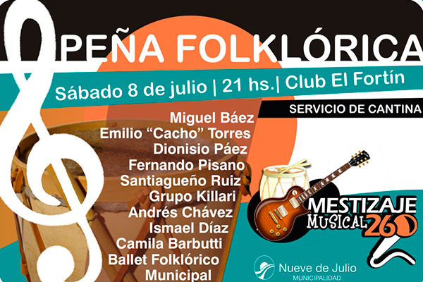 La Secretaría de Cultura, Educación y Deportes de la Municipalidad de Nueve de Julio a través de la Dirección de Cultura, continuará dando forma, el sábado 8 del corriente, desde las 21,00 hs., en el salón del Club Atlético El Fortín, al proyecto “Mestizaje Musical 260”, que recorrerá los barrios de la ciudad, el partido y ciudades vecinas, y que surgió como resultante del consenso de una serie de reuniones con músicos locales en la sede del nuevo Museo, Archivo Histórico y Centro Cultural “Julio de Vedia”.