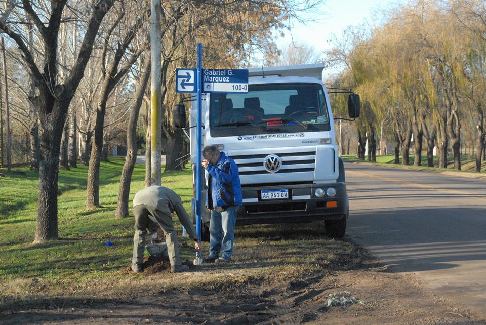 Tras haberse completado recientemente esta tarea en barrio La Boca, y Acceso Pte Perón se continuará próximamente por barrio Luján, Acceso Alte. Brown y las localidades de Facundo Quiroga y Dudignac, instancia para la cual el Intendente Municipal, efectuó la entrega de un subsidio al establecimiento educativo, destinado a la compra de materiales para la construcción de los carteles.