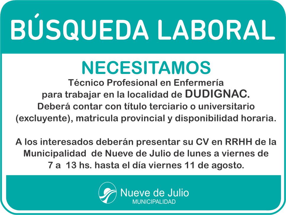 La Municipalidad de Nueve de Julio, a través de la Dirección de Recursos Humanos se encuentra realizando una búsqueda laboral orientada a un Técnico Profesional en Enfermería para desempeñarse en la localidad de Dudignac.