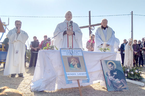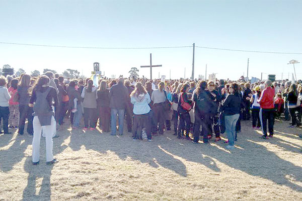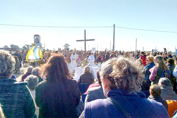 Unas 700 personas participaron de la misa celebrada por monseñor Ariel Torrado Mosconi y por los curas Juan Pellegrino y Luis Dhiel de Trenque Lauquen. En un altar armado para la ocasión y bajo el calor del sol que menguó el fuerte viento que sopló durante toda la tarde, el obispo alentó a los fieles a “salir a peregrinar como nos pide el Papa Francisco”.