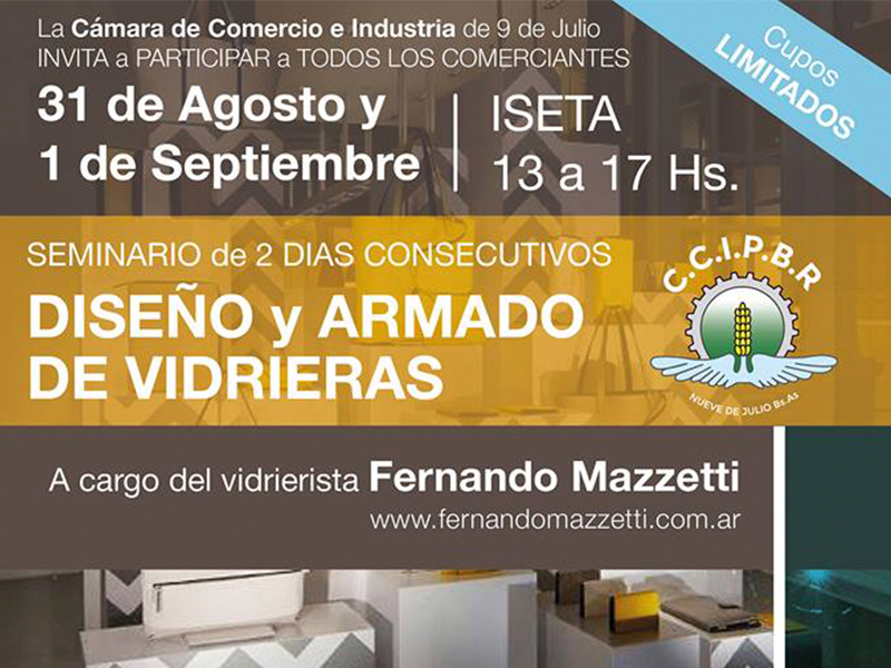La Cámara de Comercio e Industria de 9 de Julio invita a participar a todos los comerciantes del “Seminario de Diseño y Armado de Vidrieras” a cargo del vidrierista Fernando Mazzetti, a realizarse el 31 de Agosto y 1 de Septiembre en ISETA de 13:00 a 17:00 horas.