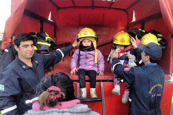 Los servidores públicos se hicieron presentes con la unidad recientemente incorporada, el camión Unimog y la escalera mecánica, despertando gran interés en los chicos y sus familias, a quienes tras la visita, les entregaron una golosina, compartiendo una inolvidable experiencia.