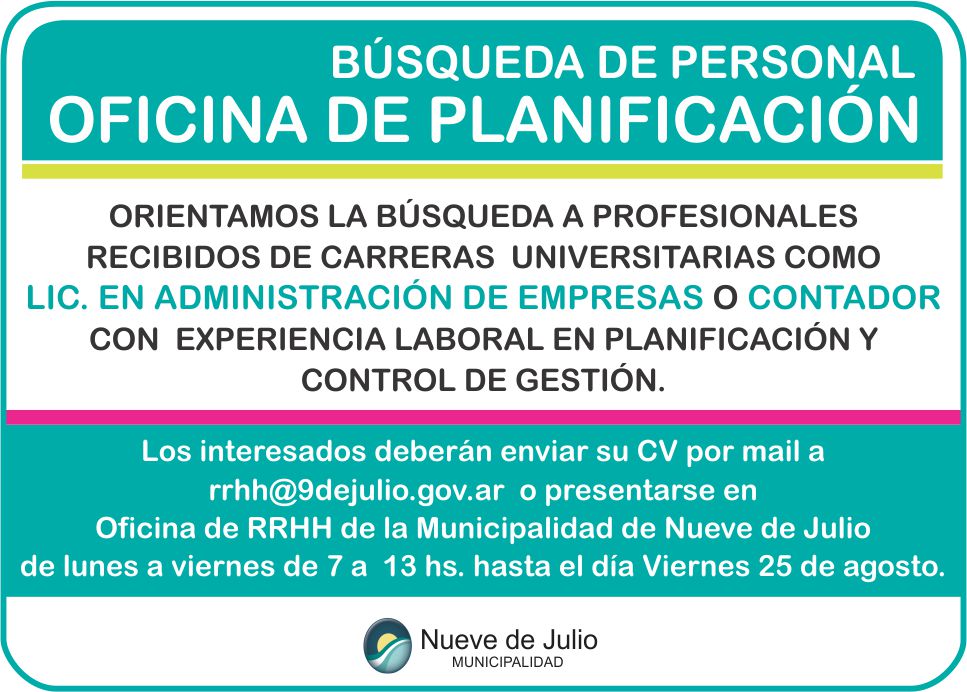 La Municipalidad de Nueve de Julio, a través de la Dirección de Recursos Humanos se encuentra realizando una búsqueda laboral orientada hacia la Oficina de Planificación.