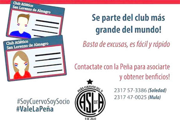 La Peña local del Club Atlético San Lorenzo de Almagro “Cuervos del 9”, está llevando a cabo una campaña que entrega la posibilidad de asociar cuervos y cuervas directamente, en dos simples pasos y a montos accesibles.
