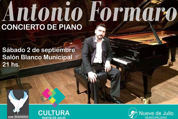Hoy sábado 2 de septiembre a las 21 hs. en el Salón Blanco Municipal, se presentará Antonio Formaro, quien es considerado “uno de los mejores pianistas argentinos” (Buenos Aires Herald) y como un “pianista de extraordinario talento” (Lazar Berman). Formaro se ha consolidado en su carrera tanto por su brillantez técnica y profundidad interpretativa como por su extraordinaria formación musical.