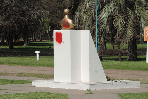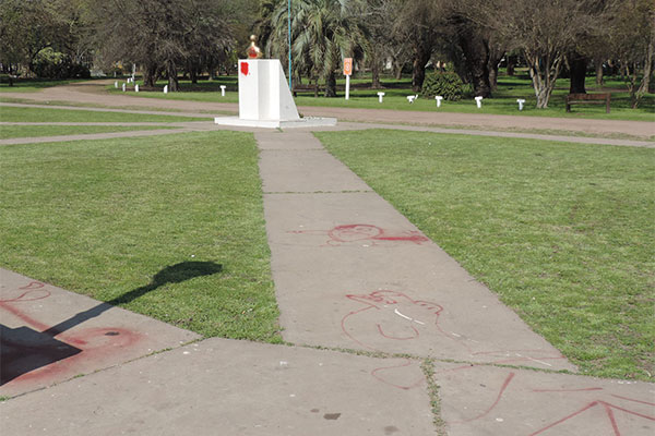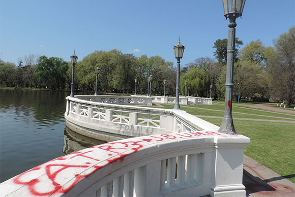Durante el pasado fin de semana, manos anónimas cometieron nuevamente actos de vandalismo en el Parque Gral. San Martín, dañando a través de pintura en aerosol el murallón, caminos de hormigón de este sector y el busto del Padre de la Patria.