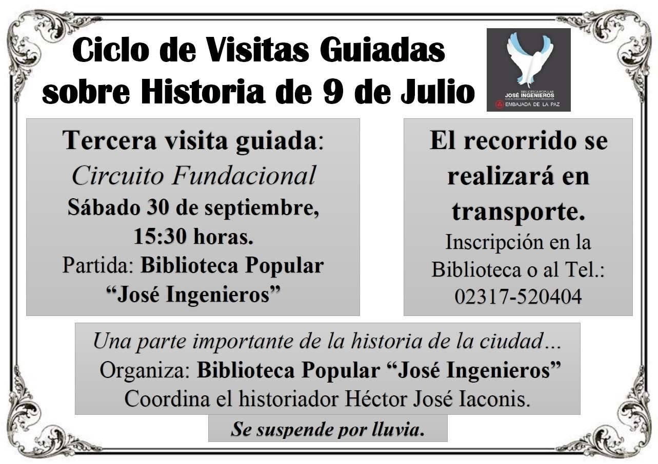 Este sábado 30 de septiembre, de 15:30 horas, la Biblioteca Popular “José Ingenieros”, continuará el ciclo de visitas guiadas sobre historia de 9 de Julio, a cargo de Héctor Iaconis.