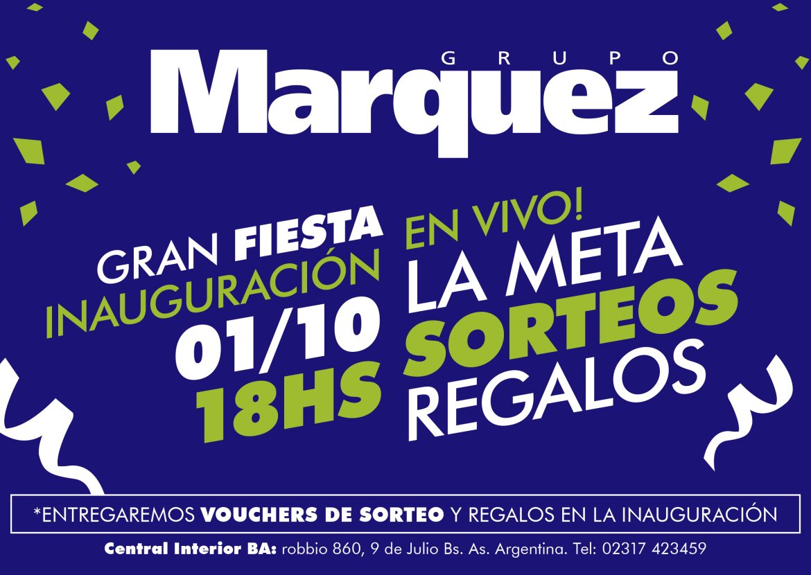 La cadena de electrodomésticos y tecnología Grupo Marquez 9 de Julio, ya palpita su gran reinauguración de su salón de ventas, que incluye el show en vivo de La Meta y sorteos de imperdibles premios (se entregan vouches).