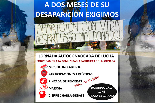 A dos meses de la desaparición forzada de Santiago Maldonado la agrupación “9 de Julio por los derechos humanos”, convoca a toda la comunidad a participar de la jornada reclamando su aparición con vida, a través del siguiente comunicado de prensa, y convocando a una marcha para este próximo domingo, a las 17 hs. en Plaza Belgrano.