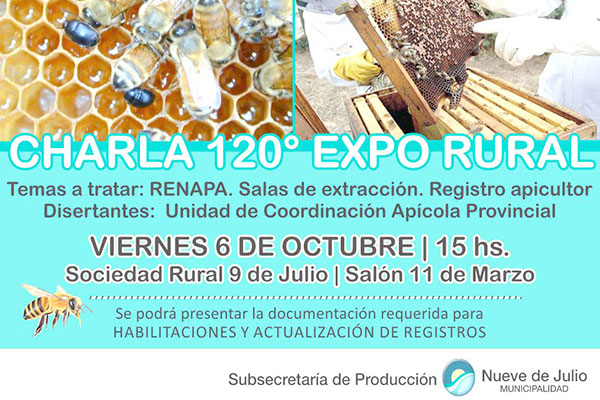En el marco de la 120 Exposición Rural de nuestra ciudad, la Subsecretaría de producción de la Municipalidad de Nueve de Julio invita a la charla que disertantes de la Unidad de Coordinación Apícola Provincial brindarán este viernes 6 de octubre, a las 15 hs., en el salón “11 de marzo” de la entidad ruralista.