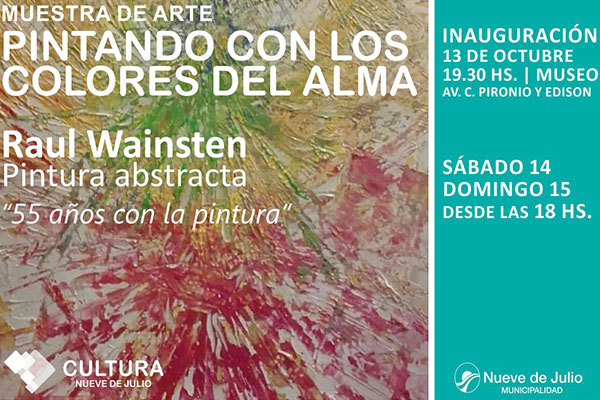 El próximo viernes 13 de octubre a las 19.30 hs, en el Museo, Archivo Histórico y Centro Cultural “General Julio De Vedia”, de Av. Cardenal Pironio y Edison, se inaugurará la muestra “Pintando con los colores del alma”, que abarca distintas piezas de pintura abstracta de Raúl Wainsten, artista de 55 años de trayectoria.