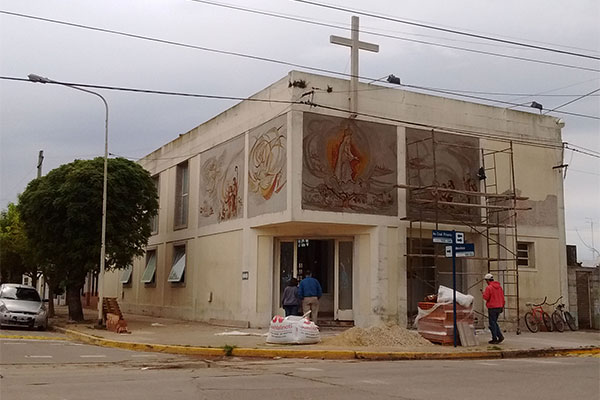 Por otra parte, la artista Corrales trabajó en la creación de los murales del frente del edificio con imágenes sobre la aparición de la virgen a los pastorcitos.