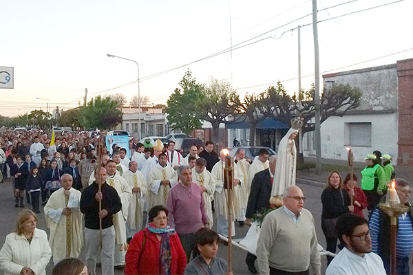 La ceremonia comenzó a las 19 hs, cuando una multitudinaria columna de fieles llega-da de todos los puntos del extenso territorio diocesano, se congregó en la capilla Sagrado Corazón para comenzar la procesión por las calles de la ciudad. Allí estuvo la imagen de la Virgen mientras duraron las obras de refacción y embellecimiento. Entre un clima de oración, donde se alternaban cantos y reflexiones se fue en procesión hasta la antigua iglesia parroquial de Fátima.