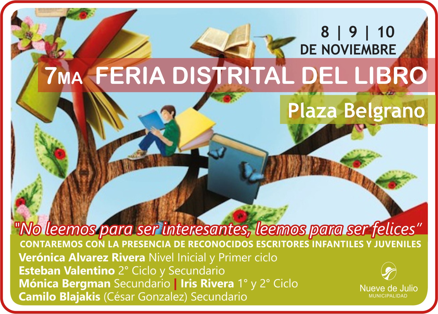 Los días 8, 9 y 10 de noviembre, con la presencia de los reconocidos escritores infantiles y juveniles Verónica Alvarez Rivera (Nivel Inicial y Primer ciclo), Esteban Valentino (2° Ciclo y Secundario), Iris Rivera (1er y 2do. Ciclo), Mónica Bergman (Secundario) y Camilo Blajakis –César González- (Secundario), se desarrollará en Plaza General Belgrano la 7ma. Feria Distrital del Libro, bajo el lema "No leemos para ser interesantes, leemos para ser felices”, de la que se irán dando a conocer las actividades programadas en los próximos días.