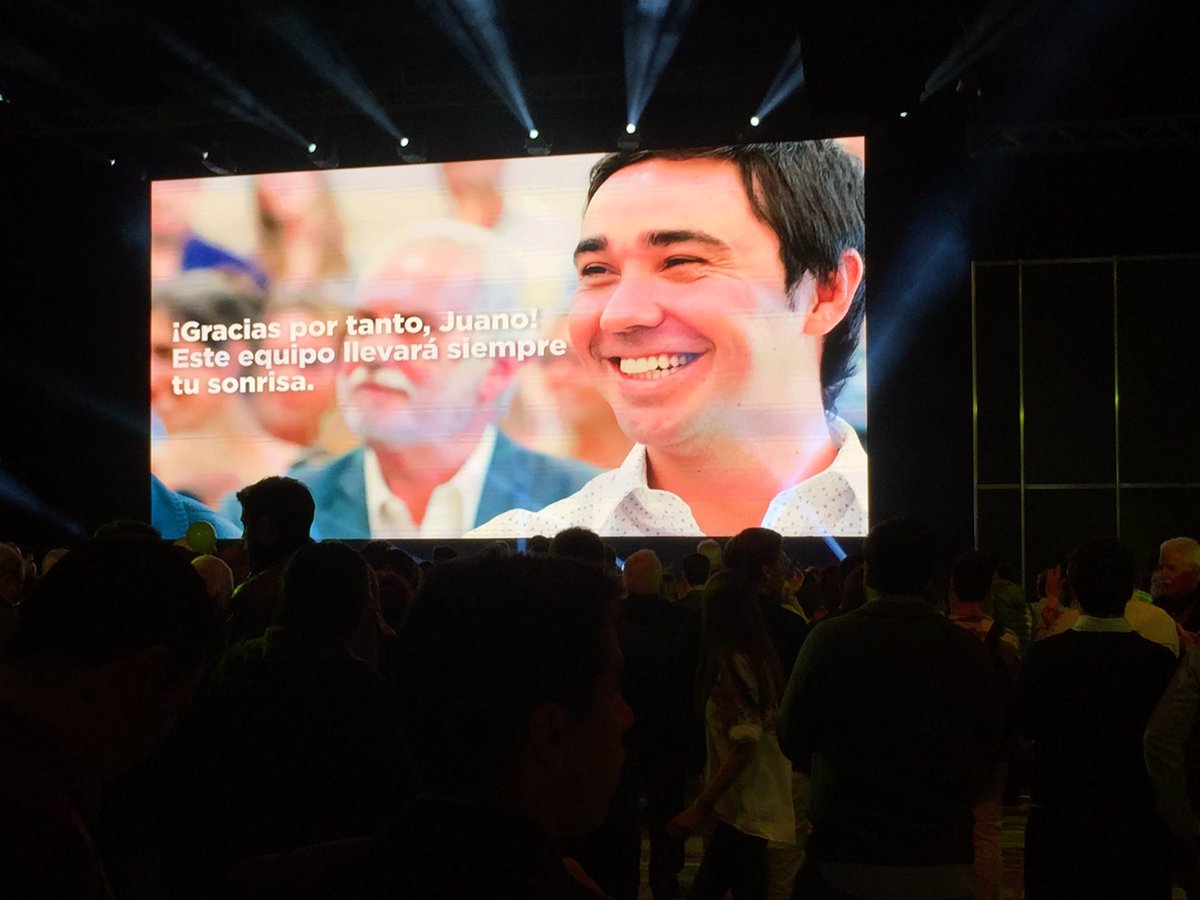 En las pantallas gigantes del búnker de Cambiemos, en Costa Salguero, se dio un homenaje al nuevejuliense Juan Gentile, quien era subsecrecretario de Comunicación Pública de la Nación.