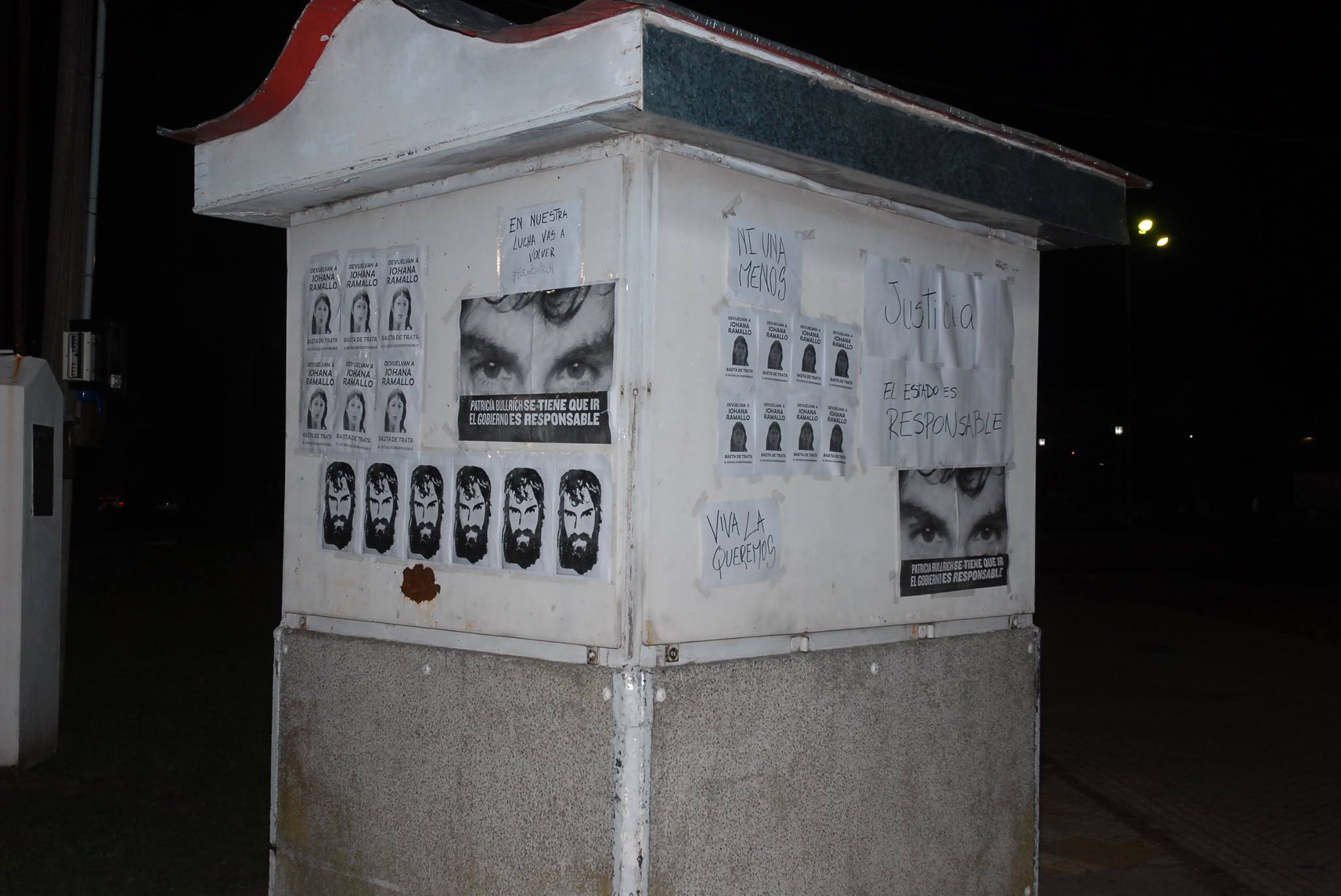 En las imágenes, se ven carteles pidiendo justicia por Santiago Maldonado y Johana Ramallo, pegados con cinta scotch en el historico Kiosco ubicado en Plaza Gral. Belgrano.