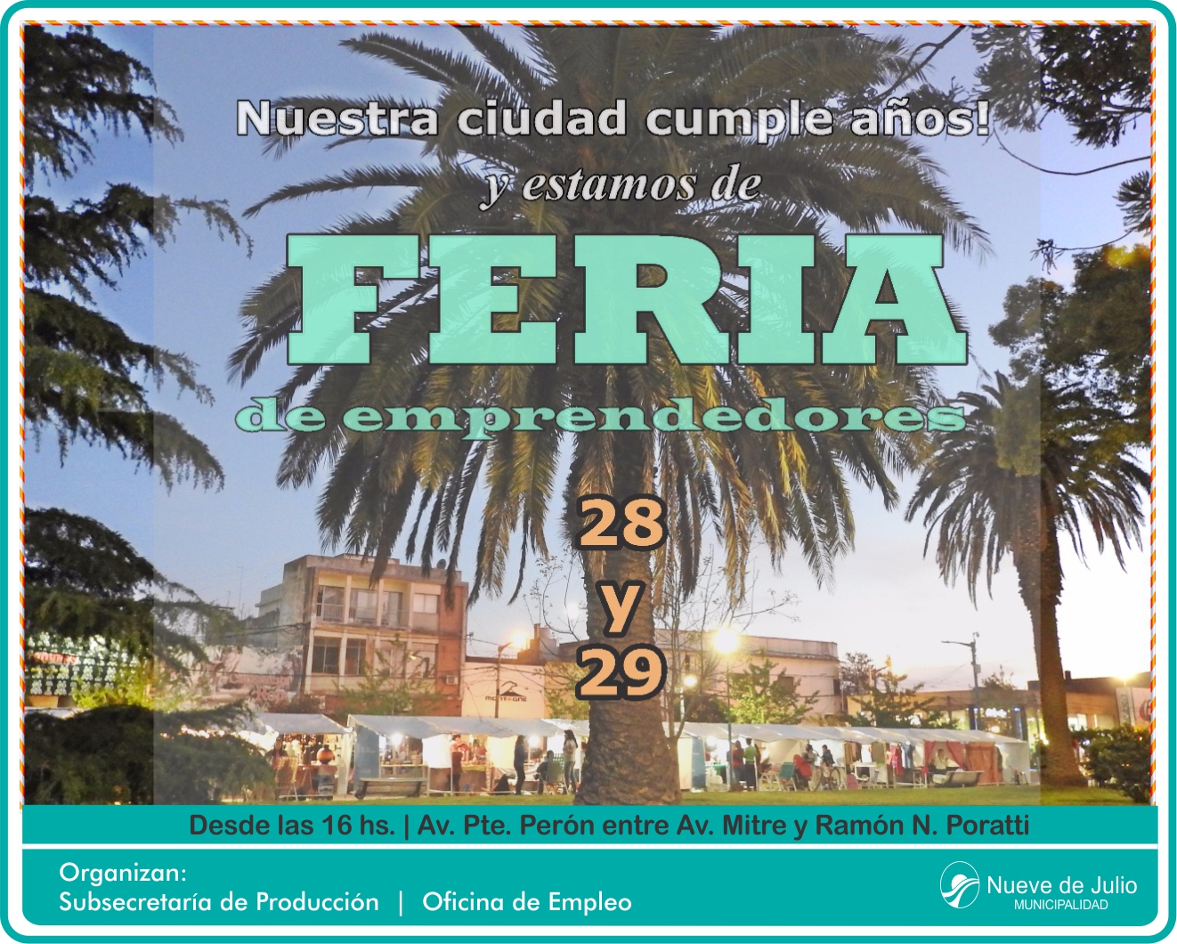 En adhesión al 154 aniversario de la fundación de la Ciudad de Nueve de Julio, durante las jornadas del sábado 28 y domingo 29, se habrá de desarrollar en Av. Presidente Perón, entre Mitre y Ramón N. Poratti una atractiva Feria de Emprendedores, promovida a través de la Subsecretaría de Producción y la Oficina de Empleo de la Municipalidad de Nueve de Julio, la que estará abierta al público desde las 16 hs.