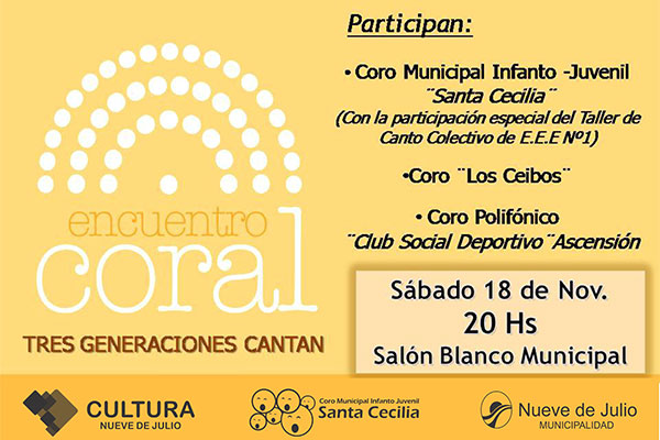 Con el auspicio de la Secretaría de Cultura, Educación y Deportes de la Municipalidad de Nueve de Julio, el Coro Municipal Infanto Juvenil Santa Cecilia, se encuentra preparando una nueva edición del encuentro coral “Tres generaciones cantan”, a realizarse el día sábado 18 de noviembre, en el Salón Blanco Municipal, desde las 20 hs.